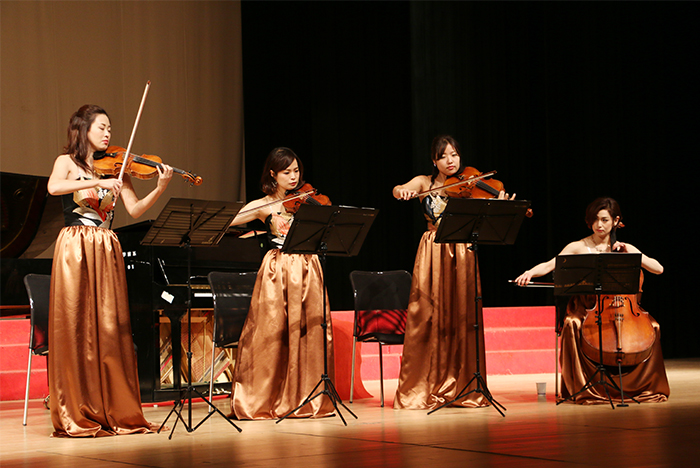 12月1日,日本东京青年古典乐团到新葡萄官网进行“2018重拾经典记忆昆明音乐会”公益演出。本次演出由昆明聂耳研究会、新葡萄8883官网AMG承办。昆明聂耳研究会会长、昆明市政协原主席、昆明登协名誉主席田云翔,昆明聂耳研究会副会长、昆明市政协原副秘书长周忻,新葡萄8883官网AMG副校长熊晶等领导嘉宾和新葡萄官网1100余名师生共享音乐盛宴。 今年是中日缔结和平友好条约40周年,也是昆明市和日本藤泽市缔结友好城市37周年,以音乐会作为文化交流活动,让师生在简朴宁静的氛围当中享受音乐的时光,共同秉承爱好和平的不变之心。 本场音乐会以弦乐四重奏和双钢琴的方式共演奏了13首中日经典名曲。音乐会上半场演奏的中国曲目《金蛇狂舞》、《梅娘曲》、《告别南洋》,改编自我国人民音乐家聂耳。演奏《梅娘曲》和《告别南洋》时,东京青年乐团特别邀请了南侨机工合唱团,采用中外结合的方式联合演出,歌曲曲调时而凄凉婉转、时而激进亢奋,以音乐之声谱写出南洋青年爱国、救国的最美篇章。以双钢琴弦乐四重奏的方式演奏的交响音乐作品《黄河钢琴协奏曲》,历久弥新,催人奋进。双钢琴版的《梁山伯与祝英台》旋律悠扬婉转,感染力极强,呈现中国经典音乐旋律以飨听众。 下半场乐团带来了八首日本经典曲目中,除了宫城道雄所做的日本民族传统曲目《春之海》外,还有很多中国观众熟悉的作品。久石让的经典名作《人生旋转木马》和《菊次郎的夏天》都是宫崎骏漫画中的音乐,乐团通过钢琴五组奏的方式将改编过的曲目进行特别呈现,让现场观众回忆满满,久久不能忘怀。两首曾入选20世纪感动日本的十大名单的《良日启程》和《津轻海峡冬景色》以乐团演奏的方式加以呈现,悦耳动听的旋律给听众一种荡气回肠,心旷神怡之感。音乐会最终在青年古典乐团和听众的互动曲目《昂首向前》中结束,该乐团带来的精彩演出获得听众的阵阵掌声。