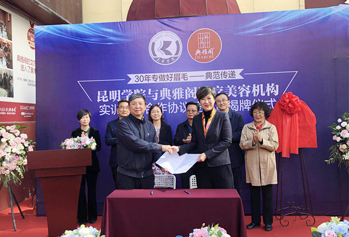 云南省卫健委科教处处长黄兴黎,学校副校长马银海、典雅阁医学美容机构总经理吴承洁出席了在典雅阁举行的签约暨揭牌仪式。参加仪式活动的还有医学院班子成员、相关专业骨干教师、典雅阁管理人员及医护人员。