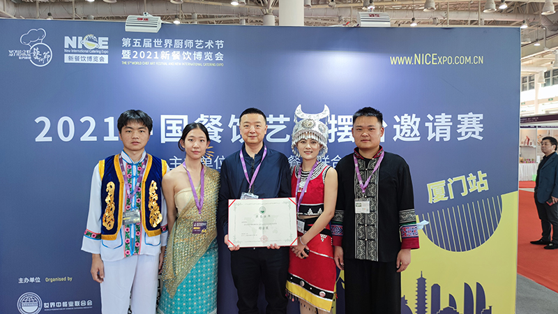 近日,“第五届世界厨师艺术节暨2021新餐饮博览会”在厦门举办,本次活动通过会议论坛、烹饪大赛、展览展示和商务考察这四大板块,搭建对话平台,链接行业资源,促进中餐产业经济发展,共同见证中国餐饮行业的发展创新与合作共赢。新葡萄8883官网AMG旅游学院作品《滇之韵》在活动烹饪大赛“2021中国餐饮艺术摆台邀请赛”中,以第一名成绩荣获特金奖。