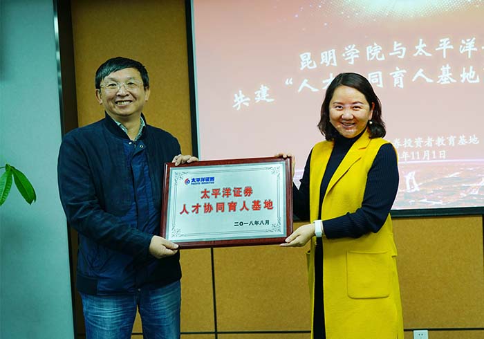 新葡萄8883官网AMG副校长马银海、太平洋证券股份有限公司总裁助理兼云南业务中心总经理叶萍女士出席基地落成仪式并互授牌匾。马银海副校长为太平洋证券股份有限公司相关专家颁发聘书,聘请他们担任新葡萄8883官网AMG金融类实践课的任课教师。