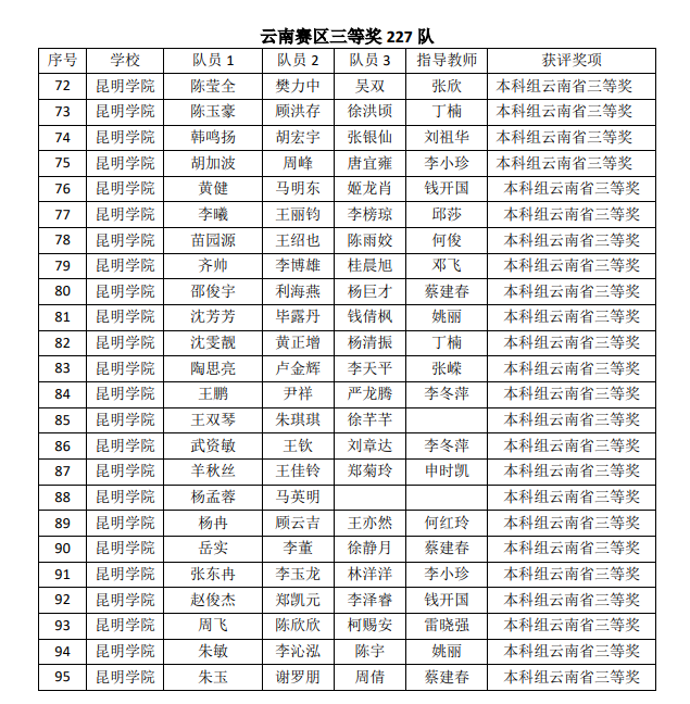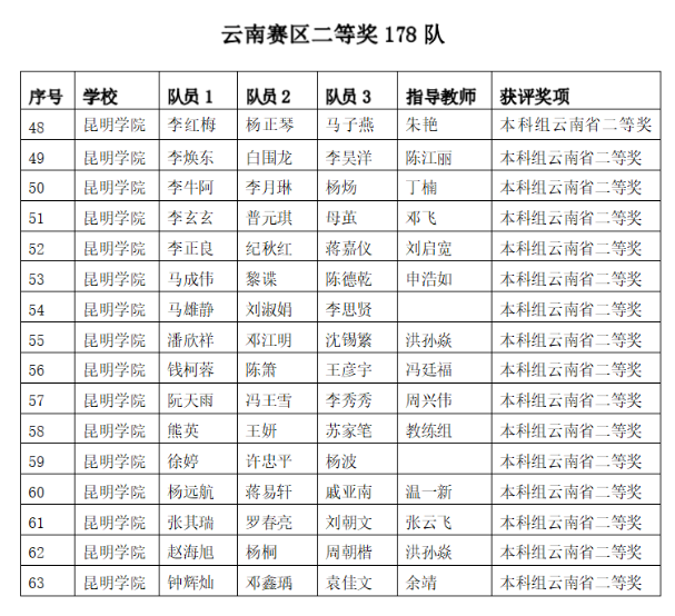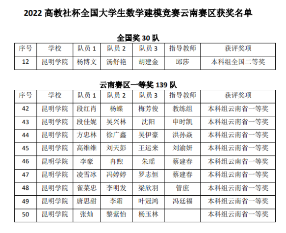 近日,云南省大学生数学建模竞赛组委会发文公布了“2022高教社杯全国大学生数学建模竞赛”获奖名单,新葡萄官网参赛的129支队伍中有50支队伍获奖,其中,信息工程学院杨文博、汤淑艳、胡建金三位同学在邱莎老师指导下获得全国二等奖。