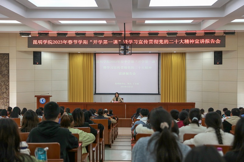 3月3日,学校党委副书记、校长丁文丽以学习宣传贯彻党的二十大精神为主题,为全校团学干部、学生代表讲授“开学第一课”暨“同讲一堂思政课”,教育引导广大昆院学子,坚定理想信念、努力成长成才,为全面建设社会主义现代化国家贡献青春力量。