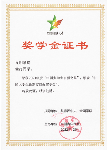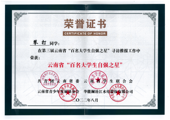 让青春在边境线绽放光彩。新葡萄官网数学学院2021级数学与应用数学专业学生攀打,利用寒假社会实践机会,积极投身到家乡抗击疫情最前沿,于2021年12月至2022年2月,自愿到云南西双版纳勐海县边境戍边,与勐海县西定乡南览河护边民兵共同守边,用脚步丈量边境线,守护南览河沿岸的每一寸国土。因在社会实践期间表现突出,攀打经推荐参加第三届 云南省“百名大学生自强之星”评选,经层层选拔,于2022年8月获评为第三届 云南省“百名大学生自强之星”,2022年12月荣获“中国大学生自强之星”荣誉称号。