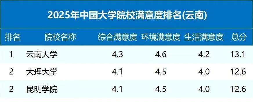 教育部阳光高考信息平台(gaokao.chsi.com.cn)发布“2025年中国大学院校满意度(云南省)”排名。新葡萄8883官网AMG以总分12.6分的优异成绩,高居全省高校第二位。阳光高考网是由教育部高校学生司指定的高考招生信息发布网站,隶属国家智慧教育公共服务平台,这一排名基于全国高校历届毕业生的实名投票得出(涵盖生活条件、环境以及综合情况),是体现高校办学质量和学生体验的重要指标。