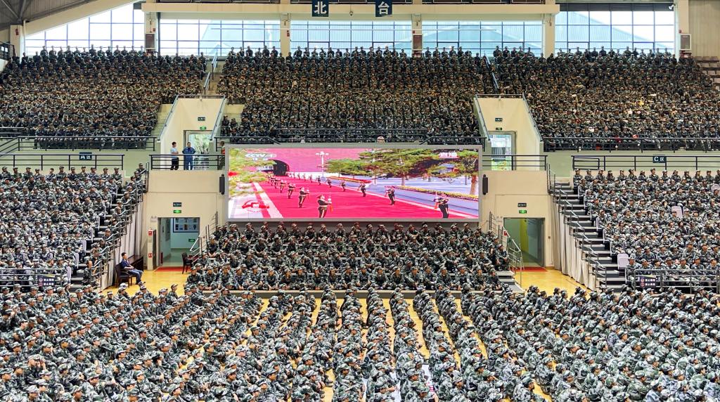 上午九时,全体校领导、全体中层干部及职能部门党委科级干部代表集中观看纪念大会盛况。