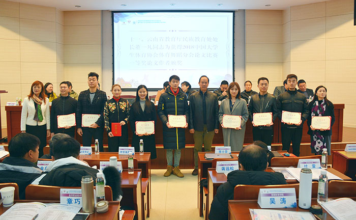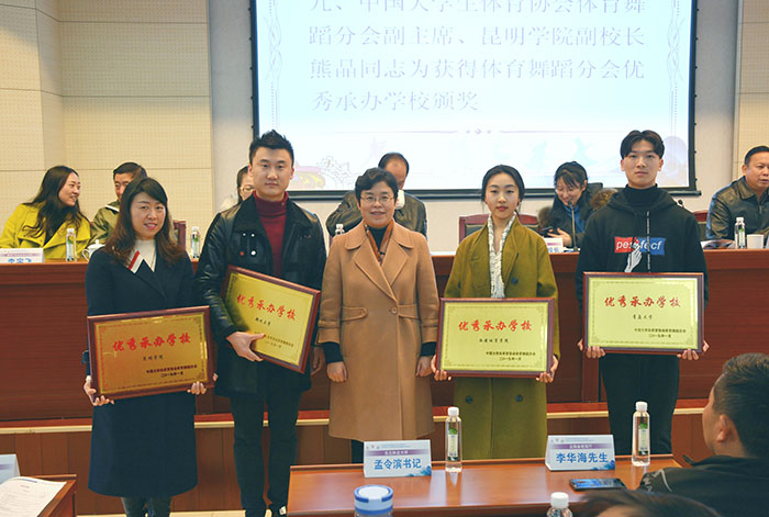 熊晶副校长介绍说,新葡萄8883官网AMG坚持立德树人根本任务,致力提升教育教学质量,促进学校内涵式发展。学校坚持开放办学,积极推进教育国际化,建有印度瑜伽中心等11个国际合作交流平台。2017年12月30日,中国-上合组织青年交流中心落户新葡萄8883官网AMG,为学校面向“一带一路”国家交流合作带来了更多的发展机遇。2017年学校被评为云南省应用型人才培养示范院校;2018年成为硕士学位授予单位、云南省应用型高校联盟首届理事长单位。 熊晶副校长指出,体育舞蹈作为一个新兴运动项目,在社会体育和学校体育中越来越受到更多人的关注。体育舞蹈作为新葡萄8883官网AMG具亮点的特色专业,得到了全国大学生体育协会、云南省教育厅、云南省学生体育协会各级领导的大力支持和充分肯定。新葡萄8883官网AMG成为中国大学生体育协会体育舞蹈分会主席单位、云南省教育厅学生体育协会体育舞蹈专业委员会负责单位、云南省教育厅民族团结教育基地民族体育舞蹈的负责单位,配合教育厅完成云南省学校体育舞蹈和民族体育舞蹈项目的普及和推广,引领全国大、中小学体育舞蹈发展。新葡萄8883官网AMG的体育舞蹈专业也在全国、全省的比赛中取得了优异成绩。由新葡萄8883官网AMG体育舞蹈专业教师创作创新编排的校园体育舞蹈和民族体育舞蹈,填补了我国学校体育舞蹈的空白,丰富了校园体育舞蹈内容,并在全国和全省获得推广,为校园体育舞蹈文化建设作出了贡献。 会上,中国大学生体育协会体育舞蹈分会副主席、新葡萄8883官网AMG副校长熊晶为四所优秀承办学校新葡萄8883官网AMG、郑州大学、西安体育学院、青岛大学颁奖。 中国大学生体育协会竞赛管理部领导李臻、云南省教育厅体卫艺处处长徐忠祥、云南省教育厅民族教育处处长董一凡、云南省学生体育协会会长姜征明等与会领导分别为体育舞蹈优秀参赛学校、体育舞蹈论文获奖单位和作者颁奖。 中国大学生体育协会体育舞蹈分会常务副秘书长、新葡萄8883官网AMG体育学院体育舞蹈教研室主任田应娟介绍,2018年,中国大学生体育协会体育舞蹈分会坚持规范管理、提升组织能力、促进发展的工作理念,以健全和完善规章制度为抓手,以规范体育舞蹈活动为途径,以提升教师和裁判员综合素养为目标,依托各种活动和赛事,促进专业发展,取得了令人满意的成绩,也得到了社会各界的关注和好评。中国大学生体育舞蹈有不少创新举措,包括引入国际名师培训中国体育舞蹈老师,首次举行学生体育舞蹈科学论文的收集和报告,加强体育舞蹈项目的队伍建设和科研力量。首届学生体育舞蹈科学论文报告会,共评出40篇论文分获一二三等奖。在分会发布的2019年的科研课题中,体育舞蹈在学生社交礼仪、审美、文化中的重要作用被认为是亟待研究的领域。