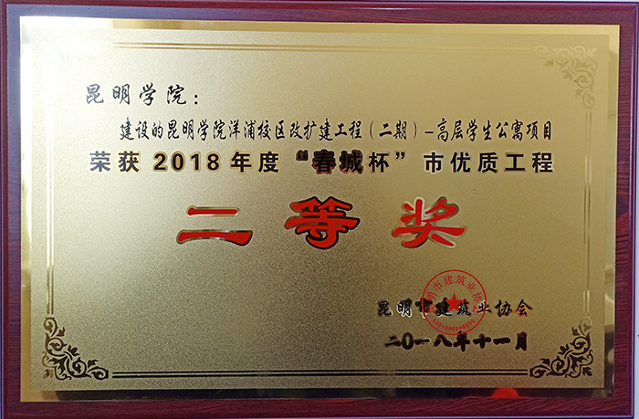 昆明市建设工程“春城杯奖”,是昆明市工程质量的最高荣誉奖。2018年3月根据《昆明市建筑工程“春城杯奖”(市优质工程)评选办法》要求,新葡萄官网将该项目进行了申报。经过初审及复审,最终荣获2018年度“春城杯”市优质工程二等奖。