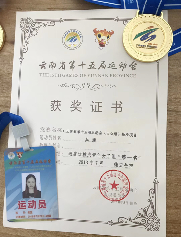 7月26日至28日,云南省第十五届运动会(大众组)轮滑项目比赛在德宏州芒市隆重举行。新葡萄官网2016级体育教育专业学生吴翡发挥出色,一举夺得女子成青年组争夺最为激烈的速度过桩冠军。