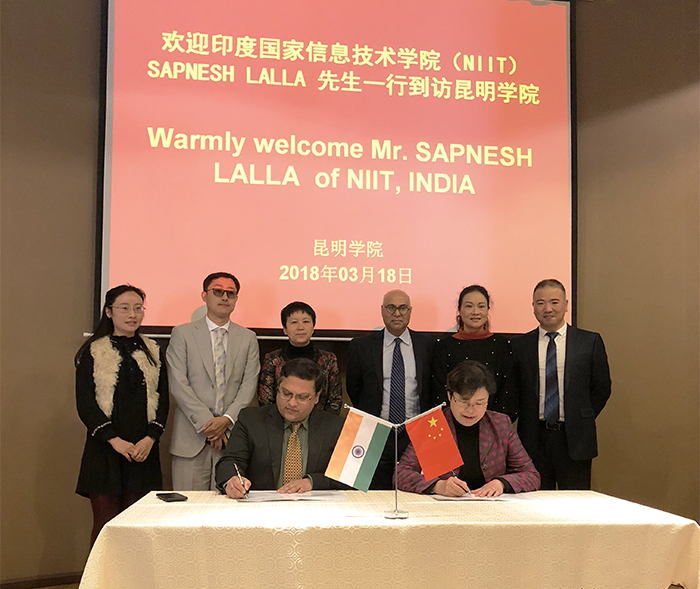 3月18日, 印度国家信息学院(NIIT)全球CEO赛普勒斯•拉乐先生Mr. Sapnesh Lalla、中国区总裁卡摩尔•杜普尔先生Mr. Kamal Dhuper、中国政府事务和商务拓展总监徐海峰先生、西南区域负责人袁野先生一行来访新葡萄官网。新葡萄官网校长黎素梅、副校长熊晶及相关部门负责人陪同来访客人参观教学、科研实验室。新葡萄官网一流的教学、科研实验室给来访客人留下了深刻的印象。