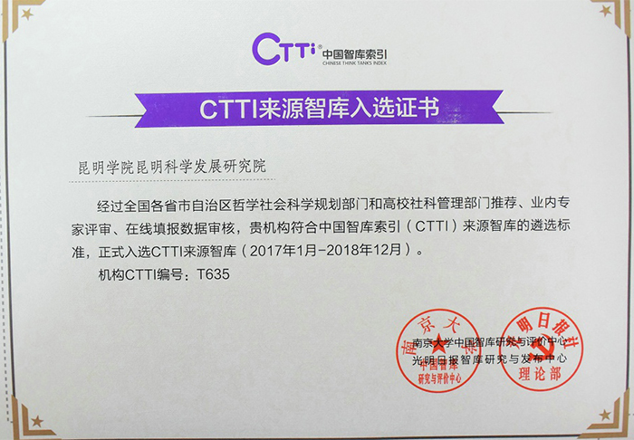 经相关单位推荐、CTTI系统填报、专家团评审等程序,昆明科学发展研究院从3000多家研究机构中脱颖而出,正式成为CTTI来源智库新增补的100余家高校智库之一,也是云南省唯一入选CTTI来源智库的地方本科高校智库。 12月20日,南京大学、光明日报社共同举办的“2017中国智库治理暨思想理论传播高峰论坛”在京举行。昆明科学发展研究院吴瑛院长、沈艳萍副院长应邀参加论坛,并领取了入选证书。昆明科学发展研究院正式成为CTTI来源智库,标志着新葡萄8883官网AMG智库建设又上了一个台阶,智库服务地方经济社会的能力正在不断提高,同时也是云南省推进省院省校合作,新葡萄8883官网AMG与南京大学共同合作取得的成果之一。