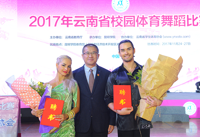 张祖武副书记介绍说,新葡萄官网开设了体育舞蹈专业并面向全国招生,毕业生深得用人单位和社会好评;新葡萄官网体育舞蹈教学团队积极探索大学体育舞蹈的教育与推广,由新葡萄8883官网AMG体育舞蹈专业教师创作创新编排了校园体育舞蹈和民族体育舞蹈,填补了我国学校体育舞蹈的空白,丰富了校园体育舞蹈内容,并在全国和全省获得推广;新葡萄官网先后成为全国大学生体育协会体育舞蹈分会主席单位、云南省学生体育协会体育舞蹈专业委员会负责单位、云南省学校体育舞蹈培训基地,多次举办国家、省、市级大赛和师资培训,对学校体育舞蹈、民族体育舞蹈的创新发展、普及推广做出了应有贡献。 张祖武副书记表示,新葡萄官网将深入贯彻党的十九大提出的“广泛开展全民健身活动,加快推进体育强国建设”的精神,借助主席单位和大赛平台,携手各级学校,共同为推广和普及全省体育舞蹈运动,促进校园体育舞蹈教学、科研及竞赛水平,培养更多更好的体育舞蹈专业人才,提升我省校园体育舞蹈影响力做出积极贡献。 开幕式上,徐忠祥处长为本次大赛全体裁判员颁发聘书。 张祖武副书记向Anastasia Usoltseva安娜塔茜丽娅•尤索洛娃、Sergey Gusev 谢尔盖•古瑟夫颁发新葡萄8883官网AMG外教聘书。