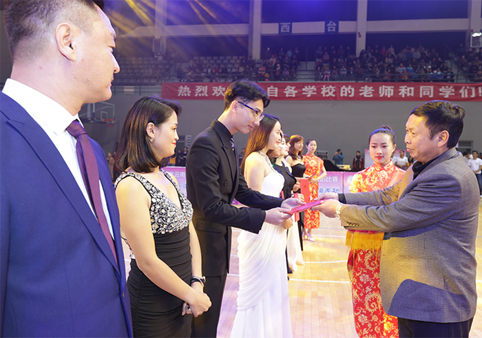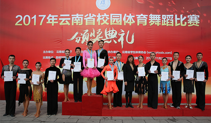 随后,比赛正式开始。来自全省50余所学校近2000余名选手,纷纷登台亮相展示自己的舞蹈技艺。靓丽的身影,婀娜的舞姿,澎湃的激情,为观众展示了体育舞蹈的魅力。雍容华贵的华尔兹,动感绚丽的恰恰,轻盈灵动的快步……曼妙的舞姿勾勒出一幅幅优美的画卷。 本次比赛总裁判长、中国大学生体育协会体育舞蹈分会常务副秘书长、云南省学生体育协会体育舞蹈专业委员会主任、新葡萄8883官网AMG体育学院体育艺术教研室主任田应娟教授为获奖者颁奖。