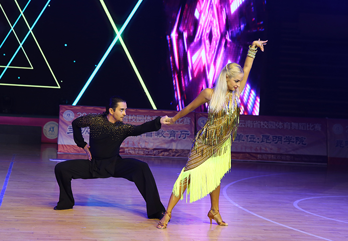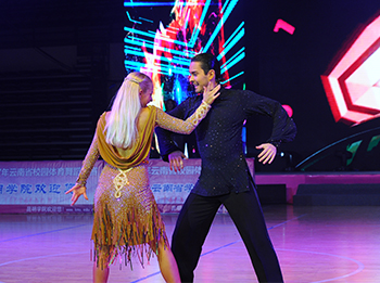 田应娟总裁判长介绍说,本次比赛是云南省学生体育协会体育舞蹈专业委员会成立后的第八个年度赛事。大赛设有拉丁舞、标准舞两个类别,伦巴、恰恰、牛仔和华尔兹、狐步、探戈等十个舞种。参赛选手来自全省大、中、小学校和幼儿园,近4000人次,规模逐年扩大。校园体育舞蹈的技术、水平大幅提高,表演舞形式多样。最大的亮点是开幕式节目表演将舞蹈和情景融入到了一起,既有我省选手的同台表演,又有国际高水平职业体育舞蹈专家表演;节目既保持了体育舞蹈的元素,又创新融入了其他艺术文化元素;是一场艺术欣赏会,更是一堂爱国主义教育课。整个开幕式表演异彩纷呈、陶冶情操、洗练志趣。 开幕式由新葡萄8883官网AMG体育学院院长孙晓坤主持。参加开幕式的还体育学院党总支副书记严春梅、副院长周明和社会各界人士近5000余名。