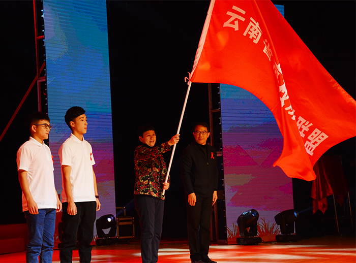 两个精彩的节目之后,云南省预防艾滋病宣传员刘伟带领青年志愿者代表们上台宣读了“云南省高校防艾联盟倡议书”。来自不同高校的同学以及青年志愿者们郑重地宣读“云南省高校防艾联盟”倡议,表明青年们防治艾滋病和追求健康美好生活的决心。 云南省教育厅赵德荣副厅长为新葡萄8883官网AMG授“云南省高校防艾联盟”旗,新葡萄8883官网AMG黎素梅校长接旗。