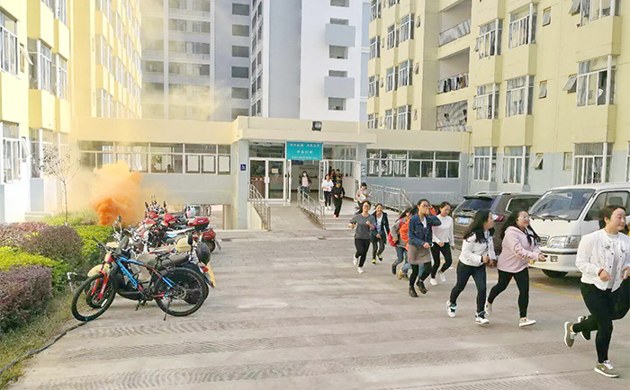 中午12:50分,澄明苑学生宿舍突发火情,“起火”位置烟雾弥漫,情况紧急。保卫处接报后,拉响消防警报,学校立即启动消防应急预案。“被困”学生在疏散引导员的指挥下捂住口鼻低姿势快速撤离“起火”现场,有秩序地向安全区域疏散。在救援过程中,保卫人员发现澄明苑4幢旅游学院实习客房中有2名“住客”被困在3楼,保卫处立即指挥微型消防站6名义务消防队员迅速携带2组逃生软梯赶到现场,将2名被困人员系上安全保护带后,从阳台顺软梯撤离到安全地带。3分钟后,澄明苑所有被困人员均安全撤离到聂耳广场。