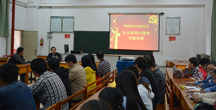 物理科学与技术系举行主题为庆祝建党96周年专题党课。党课上,师生党员以丰富的历史资料和珍贵的历史图片一起回顾了中国共产党96年的光辉历史、丰功伟绩,重点学习了中国共产党第一次全国代表大会到第十八次全国代表大会的历史发展过程,分析了每次党代会的历史意义、取得的成就。本次党课的意义在于:要求广大党员认真学习党的历史,不忘初心、继续前进,不断增强政治意识、大局意识、核心意识、看齐意识,用党的理论武装头脑、指导实践、推动工作,以实际行动争做“四讲四有”合格党员。
