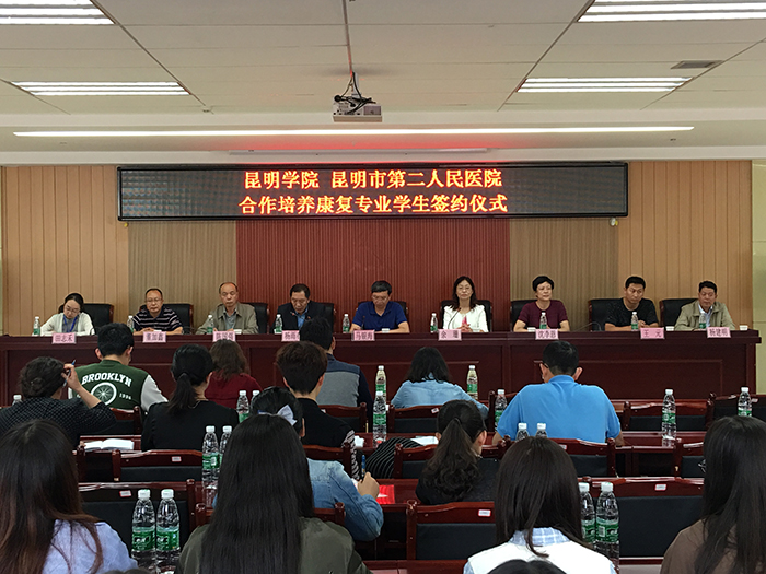 7月12日,新葡萄官网与昆明市第二人民医院合作培养康复人才签约仪式,副校长马银海、医学院院长余珊、市二院党委书记杨春雨、副书记沈李恩、副院长陈国强及医学院康复教研室教师、市二院康复科、相关科室医护人员和实习学生参加了签约仪式。