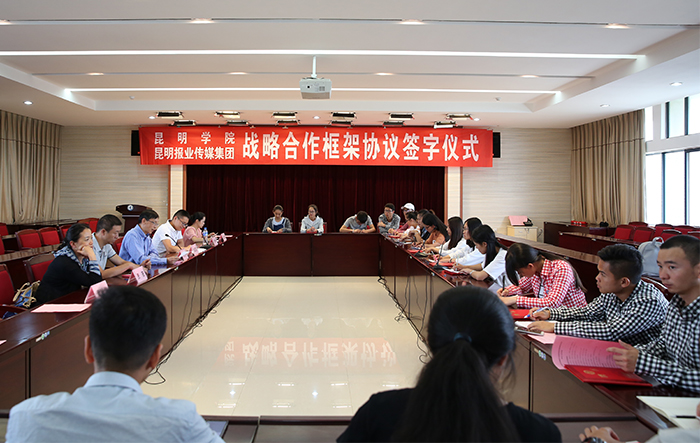 签约仪式由党委宣传部部长李剀主持。昆明报业传媒集团党委委员、昆明日报社副社长刘云坤,集团办公室主任孙丽玲,集团办公室副主任兼监察室主任李严,昆明日报经济新闻中心副总监母昌买,昆明日报综合新闻中心副总监贾薇,都市时报副总编辑何早阳,昆明信息港总编辑宋建波,昆明日报经济新闻中心经济新闻部主任刘瑞,掌上春城主编秦聪俊和新葡萄官网校党委办公室、校长办公室、党委宣传部、教务处、科研处、招生就业处、人文学院、美术与艺术设计学院、信息技术学院、继续教育学院、昆明科学发展研究院、昆明滇池(湖泊)污染防治合作研究中心、滇池泛亚合作战略研究院、昆明市物联网及泛在工程技术中心等职能部门、教学院系、科研平台负责人,全体受聘“大学生特约评报员” 参加签约仪式。
