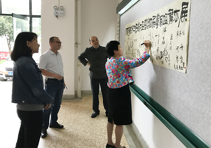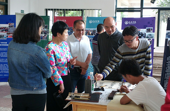 黎校长被一幅幅颇具神韵的书法作品所吸引,称赞同学们的书法功底和审美情趣。自机学院15级电气3班的吴才华和社会管理学院14级人力资源管理2班的毕键同学进行了现场书法表演,得到了在场老师和同学们的赞扬。黎校长鼓励同学们继续保持书法爱好,把中华优秀文化传承下去。黎校长的到来使在场的书法爱好者受到了极大的鼓舞。黎校长还参观了城建学院正在展出的建筑学专业学生的毕业设计展,对学生毕业设计给予了充分肯定。