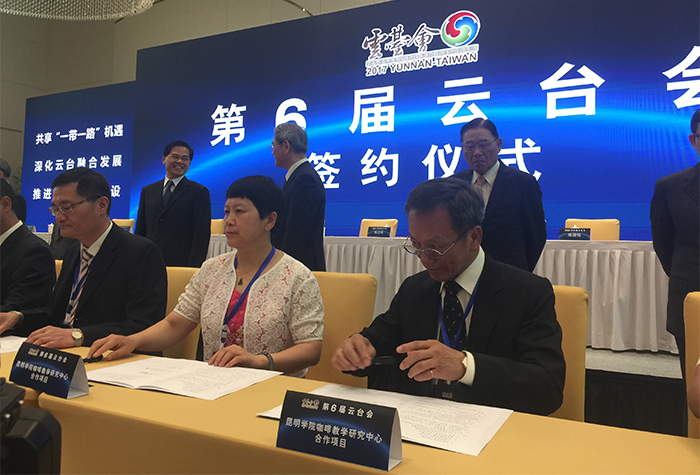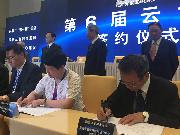 在中共中央台湾工作办公室、国务院台湾事务办公室主任张志军,海峡两岸关系协会会长陈德铭;中共云南省委书记、省人大常委会主任陈豪,省委副书记、省长阮成发;中国国民党副主席林政则,台湾三三企业交流会会长江丙坤各位领导的见证下,黎素梅校长代表新葡萄8883官网AMG和台湾岚山咖啡公司董事长游启明先生签署了建立“咖啡教学研究中心”的协议。