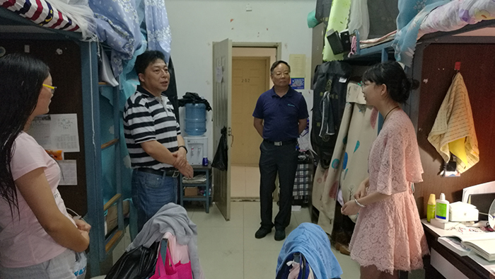 沈凡副校长实地察看了宿舍居住环境,与同学热情交谈,详细了解了同学们的家庭、学习、生活情况,并认真听取同学们对学校的意见和建议。