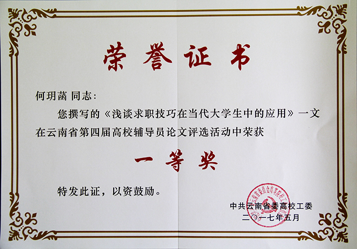 云南省第四届全国高校辅导员工作优秀论文评选,新葡萄官网推荐报送的四篇参评论文有两篇分获一、二等奖,其中美艺学院辅导员何玥菡老师的论文《浅谈求职技巧在当代大学生中的应用》获一等奖,旅游学院辅导员金刚老师的论文《浅谈高校辅导员的工作担当与责任》获二等奖。