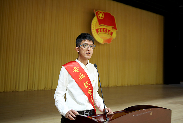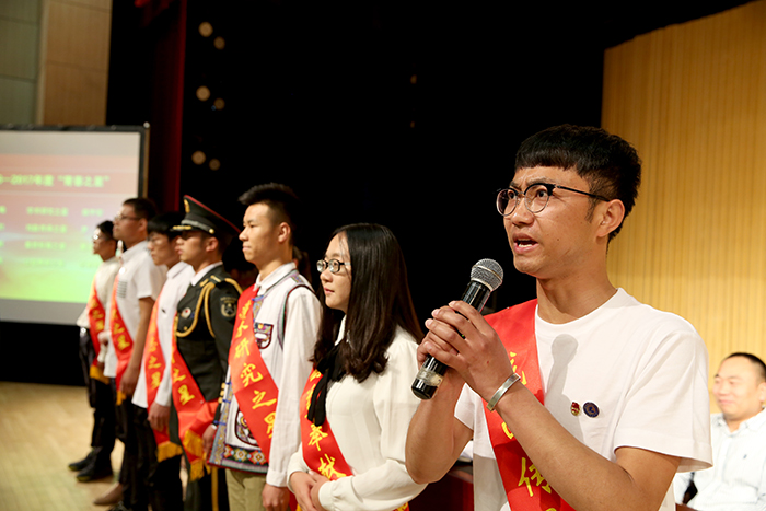 团员代表、专业技能之星王嘉曦同学发言。从专业学习、社会实践、创业创新等方面,分享了自己的学习成长经历。讲述了他在校期间美术作品获得国家级奖项8次、省级和校级奖项19次、留校收藏作品10幅,荣获了第十二届云南省大学生年度人物、连续三年获新葡萄8883官网AMG三好学生、2015年获得中国美术学院社会美术水平考试山水8级证书、2017年获国家奖学金等12项荣誉称号。同时他在大一学年就举办美术作品联展,四年来坚持手绘新葡萄8883官网AMG每一处风景的明信片,运用创新创业实践与同学共同开了淘宝店。他用自己的经历告诉我们要珍惜青春、努力学习、回报父母、奉献社会。