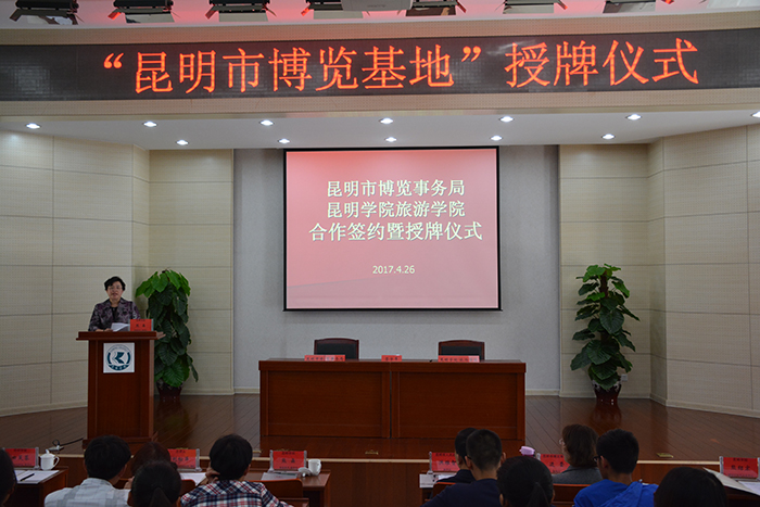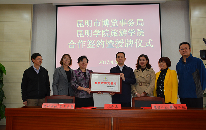 4月26日,昆明市博览事务局与新葡萄官网旅游学院签订合作备忘录并举行授牌仪式。昆明市人民政府副市长洪维智与新葡萄8883官网AMG副校长熊晶共同为“昆明市博览基地”揭牌。昆明市博览事务局局长周燕、副局长边莹、广东会展企业协会会长刘松萍出席了授牌仪式。