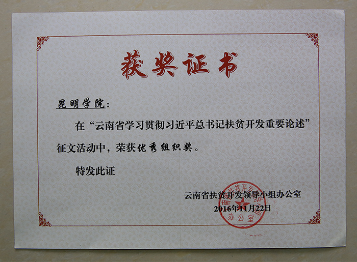 经征文活动组委会组织专家评审,新葡萄官网共有3篇文章受到表彰,占高校系统获表彰文章总数的23%。其中:校党委书记陈世波教授撰写的文章《高校在“脱贫攻坚战”中的责任担当》荣获一等奖并经组委会推荐在《云南日报》刊发,昆明滇池(湖泊)污染防治合作研究中心教师、学校派驻东川区因民镇因民社区扶贫工作队员代山庆博士撰写的文章《准确理解习近平总书记扶贫开发思想》荣获三等奖,物理科学与技术系党总支书记王宁副教授撰写的文章《“三江并流”地区生态扶贫路径探析》荣获三等奖。