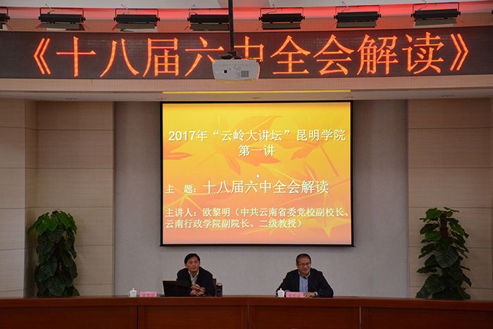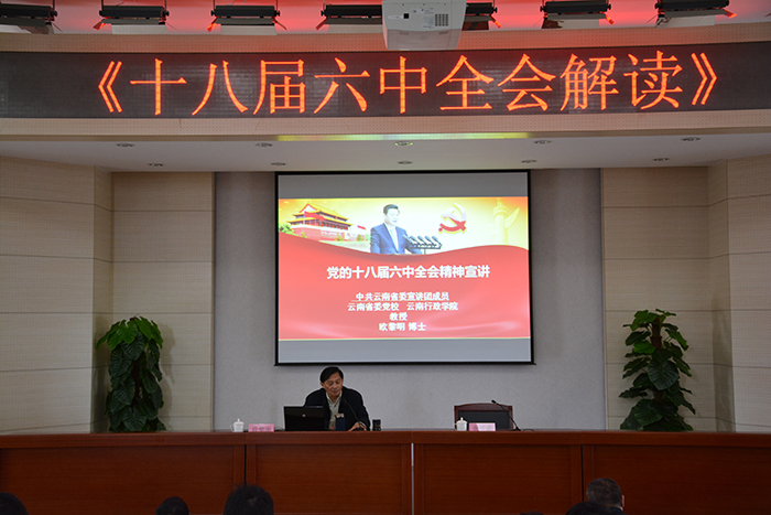 4月7日,由省委宣传部、省社科联主办,新葡萄8883官网AMG党委宣传部、机关党总支、昆明科学发展研究院共同承办的“云岭大讲坛﹒昆明讲坛(新葡萄8883官网AMG)”第一讲在新葡萄8883官网AMG开讲。云南省委党校副校长、云南行政学院副院长欧黎明教授应邀主讲《十八届六中全会解读》。学校党委副书记张祖武主持报告会。