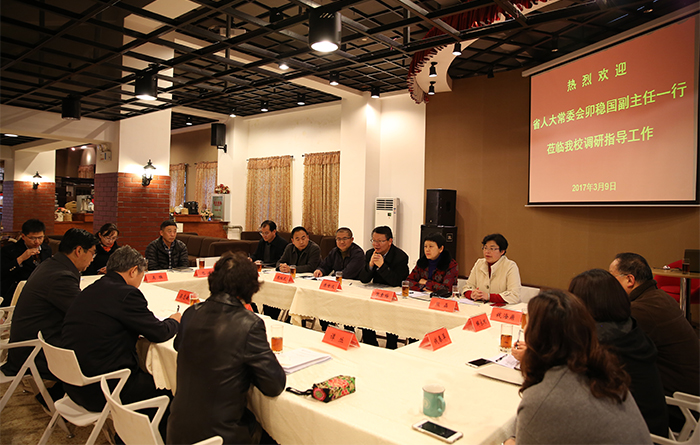3月9日,省人大常委会副主任卯稳国率省人大常委会内务司法委员会主任梁志敏、法制工作委员会副主任(正厅级)谭丛到新葡萄官网调研指导工作,充分肯定新葡萄官网十二五期间取得的显著成绩,对新葡萄官网办学定位、学科建设、教育教学质量提升、学生综合能力培养、服务地方经济社会和校园建设等工作给予高度肯定和赞誉。学校党委书记陈世波,校长黎素梅参加调研并介绍学校人才培养、社会服务等办学情况。