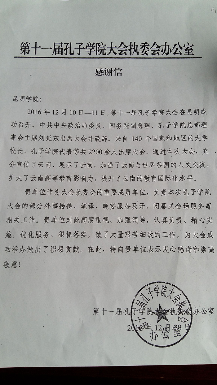 在会议期间,新葡萄官网作为大会执委会的重要成员单位,学校高度重视,在熊副校长的带领下,负责本次孔子学院大会的部分外事接待、笔译、晚宴服务及开、闭幕式会场服务等相关工作,陈世波书记、黎素梅校长、熊晶副校长出席大会闭幕式。新葡萄官网出色完成各项任务,工作得到孔子学院大会执委会办公室的充分肯定,并专门发来第十一届孔子学院大会执委会办公室的感谢信。