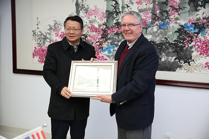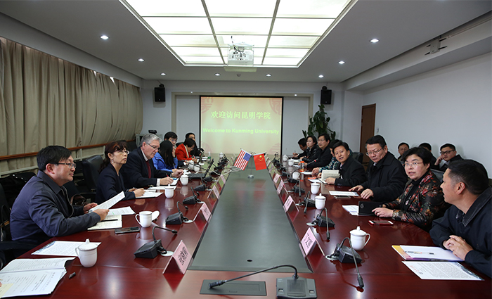 2月27日,在昆明市副市长孙涛的陪同下,美国康伯斯威尔大学执行副校长H.Keith Spears教授、中国项目负责人郭浩博士、中国顾问刘迎春一行到新葡萄官网交流访问,就双方发挥教育优势,开展全方位、深层次合作项目进行磋商,双方达成合作意向并签署合作备忘录。 新葡萄官网党委书记陈世波、校长黎素梅、副校长熊晶接待了来宾,对来宾表示欢迎,并介绍了学校办学情况、办学特色和优势,表达了合作意向,提出了合作愿景和目标要求。