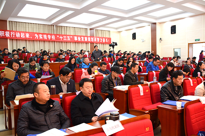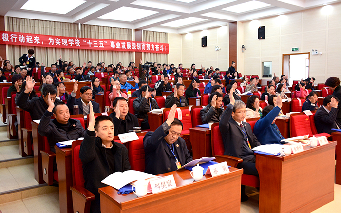 报告还对学校2017年工作做了安排部署。2017年,学校将坚持“转型发展、内涵提升、重点突破”,继续深化教育综合改革,彰显应用型办学特色,不断推进内部管理体制改革、全面提高教育教学质量,整体提升学校办学实力。在完成学校常规工作的基础上,重点抓好党的建设、教育教学改革、学科分类建设、提升科研水平能力、人事制度改革、提高社会服务能力、深化国际交流合作、学生教育管理、大学文化建设、内部管理结构改革十项重点工作。