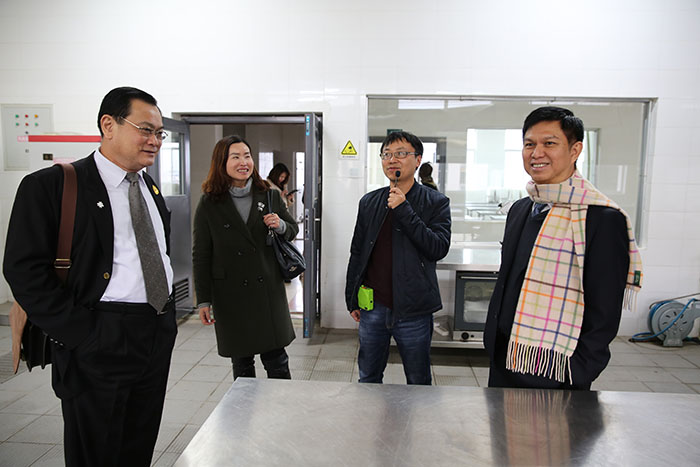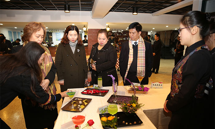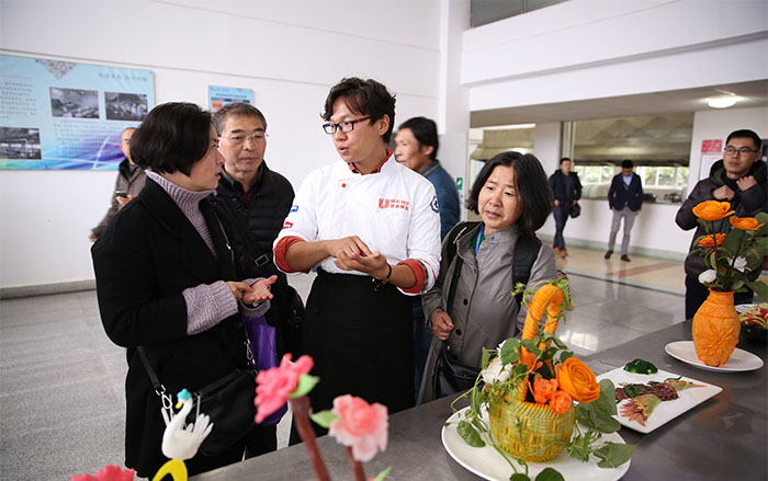 合作协议签字仪式后,来访代表一行在新葡萄官网旅游学院院长田芙蓉、党总支书记熊绍宏等负责人的陪同下参观了校园环境建设,深入旅游学院烹饪实训中心、旅游酒水实验室等教学场所进行参观考察,与正在实训的学生进行热切交流,对学生实训作品进行评阅,并在作品前驻足留影。新葡萄官网一流的教学设施、特色的餐饮教学赢得代表们赞不绝口,给予一致好评和高度赞誉。
