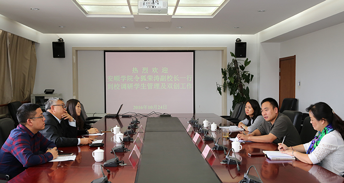 10月24日,安顺学院令狐荣涛副校长携学生工作部部长殷红敏、副部长罗瑜一行来新葡萄官网调研交流学生工作,新葡萄官网副校长郭华、学生工作部(处)长晁丽华,副部(处)长侯青妮与来宾就辅导员班主任队伍建设、学生就业及“双创”工作等进行了深入交流和研讨。