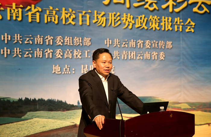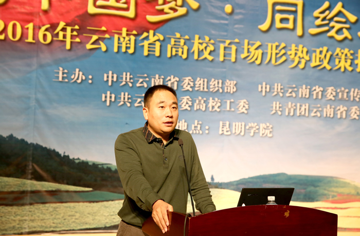 10月9日,云南省法制办党组书记、主任张宪伟同志应邀到新葡萄官网主讲“共筑中国梦•同绘彩云南”形势政策报告会,张宪伟主任以《法律与你同行——谈谈当代大学生的法律素养》为题,阐述建设法治国家、法治社会的重大意义,提出培育和快速提升青年大学生的法律素养,塑造“现代型人才”,大学生应坚持崇高法治信仰,做法治国家建设的参与者、法治校园建设的促进者,文明法治人的践行者。这是新葡萄官网“共筑中国梦•同绘彩云南”2016年第3场形势政策报告会。