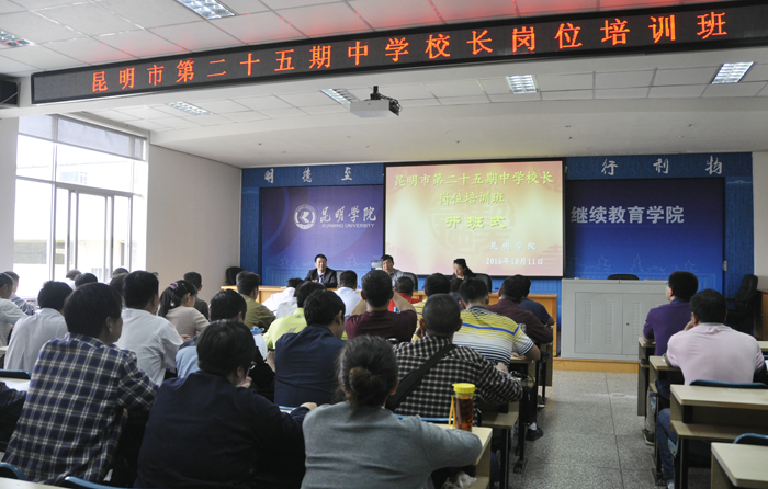 10月11日,昆明市第25期中学校长岗位任职资格培训班在新葡萄8883官网AMG继续教育学院开班。来自全市的50余位中学校长、副校长、书记、副书记将在这里进行为期近两个月的脱产集中学习。新葡萄8883官网AMG马银海副校长、昆明市教育局师训处杨朝晖处长出席开班式,开班式由继续教育学院主持工作副院长张培宏主持。