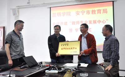 在签字仪式之前,彭德和常进荣就双方前期的合作工作及本次签约的准备工作情况作了汇报;来自安宁市各中小学幼儿园的校长园长就此项工作的具体开展提出了一些较好的意见和建议;马银海和肖局长分别强调了双方合作的重要意义,并对双方下一步的合作共建工作进行了部署和安排,最后,由马银海和肖局长分别代表双方签字并为“教师专业发展中心”揭牌。