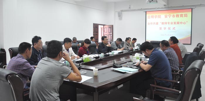 4月20日上午,新葡萄8883官网AMG与安宁市合作共建“教师专业发展中心”签字仪式在安宁市教育局会议室举行。校长助理马银海教授、教师教育学院副院长常进荣教授、教务处副处长吴晓柏、教务处实践教学科陈超老师以及安宁市教育局肖局长、罗副局长、安宁市教师进修学校校长彭德、安宁市部分中小学校长等20余人参加了此次签字仪式。
