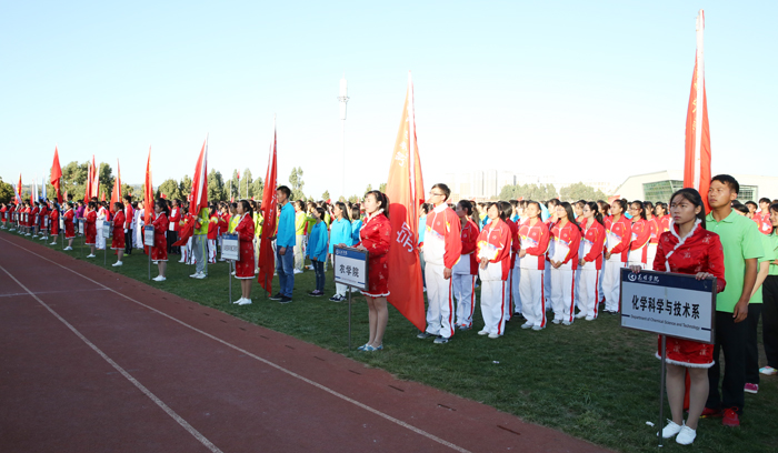 上午8:30,组委会副主任、副校长郭华一声“运动员入场”令下,由18个院系及部门组成的20余个队列,踏着欢快、激昂、奋进的《运动员进行曲》,迈着整齐矫健的步伐、喊着各自铿锵有力的口号,依次通过主席台,充分展示了“完全人格,首在体育”的理念精神。