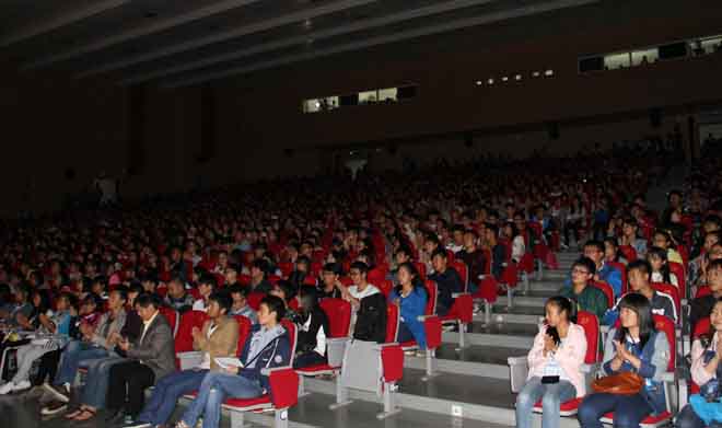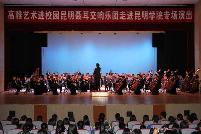 10月21日晚,2015年高雅艺术进校园之昆明聂耳交响乐团新葡萄8883官网AMG专场演出在学生会堂举行。副校长郭华、部分中层干部、各院(系)团总支书记、辅导员、各院(系)师生代表1000余人观看了演出。