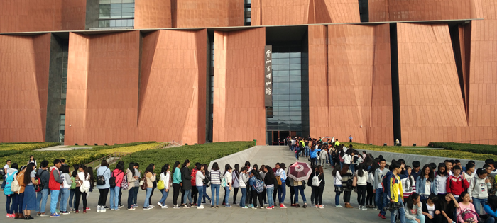 10月17日,城建学院、旅游学院、教师教育学院、体育学院、外国语学院、农学院、音乐学院2015级1100多名同学,由学生处老师及院系辅导员带队前往云南省博物馆新馆参观。此次参观活动是根据《新葡萄8883官网AMG关于做好2015级新生入学教育工作的通知》精神,结合新葡萄官网2015级学生入学教育的实际情况,将参观云南省博物馆的云南历史文明陈列专题展览作为今年新生入学教育的一项内容。为保证此次参观活动的安全顺利进行,学校前期就与云南省博物馆和公交公司积极联系协调,安排了15辆公交车接送学生。