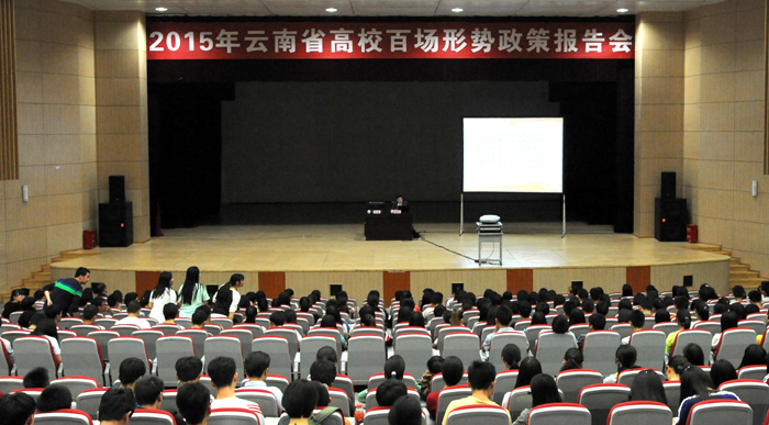 9月25日下午, 2015年云南省高校百场形势政策报告会在新葡萄官网学生会堂举行。省委党史研究室副主任杨林兴博士所讲主题是“正确认识中国人民抗日战争历史”。新葡萄官网各院系师生代表1300多人听报告。报告会由新葡萄官网党委副书记孙勇主持。