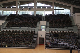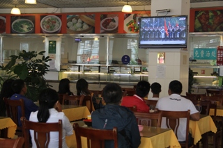 上午,2013级、2014级学生分别在博雅楼、农学楼、博识楼等地多媒体教室观看阅兵式现场直播。同时,还在各个宿舍活动室、南北苑餐厅收听收看。下午,正在军训期间的2015级新生统一在体育馆观看重播。