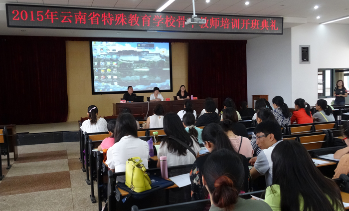 为进一步夯实我省特殊教育学校骨干教师专业知识技能,促进特殊教育事业发展,6月27日,2015年云南省特殊教育学校骨干教师培训开班典礼在新葡萄官网惟行楼5301室举行,昆明市盲哑学校校长杨志成、教师教育学院院长唐敏、教师教育学院副院长李里以及全省120名特殊教育学校骨干教师参加了此次开班典礼,开班典礼由李里主持。