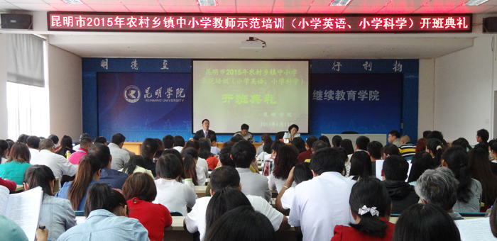 6月13日上午,昆明市2015年农村乡镇中小学教师第二期示范培训小学英语、小学科学教师培训班在新葡萄8883官网AMG昆师路校区继续教育学院举行开班典礼。来自昆明市各县(市、区)及滇中产业新区安宁、嵩明、空港经济区农村乡镇小学的103名英语教师和103名科学教师,将按学科分班进行为期7天的集中培训。