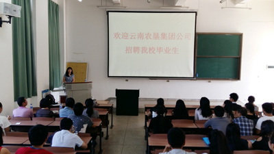 招生就业处处长包兴偕同集团公司人事部秦燕部长及下属8家企业人员来到博雅楼2103多媒体教室, 包兴首先向同学们简单介绍了集团公司的基本情况,同时要求同学们自信、自强,充分展示昆院学子风采,积极应聘、主动应聘;秦燕详细介绍了集团公司的发展历史,集团公司是云南省人民政府授权省国资委管理的省属国有重要骨干企业,是以天然橡胶生产为主,电力、商贸物流等多产业共同发展的大型集团。集团总部位于云南省昆明市,下辖二级企业28户,是云南省农业企业中唯一的国有大型骨干企业。她表示,集团公司非常重视人才队伍建设,也深深懂得,实现农垦梦,人才是关键,诚恳欢迎新葡萄8883官网AMG的学生来集团公司工作,为云南农垦奉献青春和智慧。