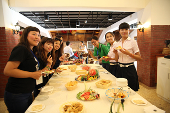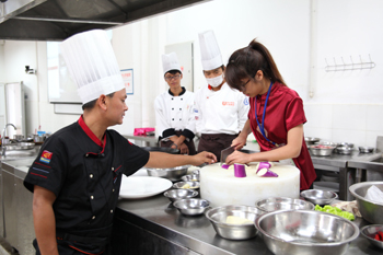 在全天的活动中,双方师生共同参观了新葡萄8883官网AMG滇池流域生态文化博物馆;步行参观了美丽校园;重点考察了旅游学院烹饪实训中心,欣赏了烹饪专业学生的雕刻技术,观摩了滇菜烹饪课程,参与制作并品尝了云南特色凉米线;在酒水实验室体验了普洱茶的芬芳及冲泡互动,在咖啡与鸡尾酒调制过程中双方学生获得了知识的互补和提升。丰富多彩的安排和体验给来宾们留下了深刻的印象,活动在相互交换礼物、合影留恋、两岸师生依依不舍中圆满落下帷幕。