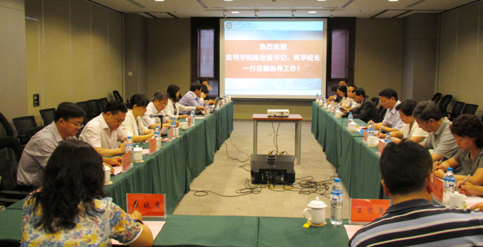 在听取昆明理工大学两位校领导的介绍后,双方就有关合作办学事宜进行了商谈。陈世波首先对昆明理工大学党政领导长期以来给予新葡萄8883官网AMG的支持、帮助和对此次来访的热情接待表示衷心的感谢;他简要介绍了新葡萄8883官网AMG建设发展改革的基本情况;希望在两校联合培养研究生、对口专业选派优秀本科生交换培养、骨干教师进修、干部挂职、相关学科学位点建设及科学研究、技术开发、科技创新等方面,得到昆明理工大学一如既往的帮助与支持,不断促进双方交流,深化推进两校合作。何华校长指出,此次到昆明理工大学,看到昆明理工大学在发展改革中特别是在科技创新方面取得的成就,倍感震感、深受鼓舞;新葡萄8883官网AMG近年来发展迅速,办学特色初步显现,但学校在师资、学位点建设、专业建设等方面,滞后于发展的要求;作为一所应用型本科院校,新葡萄8883官网AMG必须走创新创业之路,希望借助昆明理工大学的支持和帮助,共享资源,推进发展。熊晶、郭华和董建华也结合分管工作,介绍了新葡萄8883官网AMG有关方面的工作情况和与昆明理工大学开展合作、落实和推进有关项目的期待。